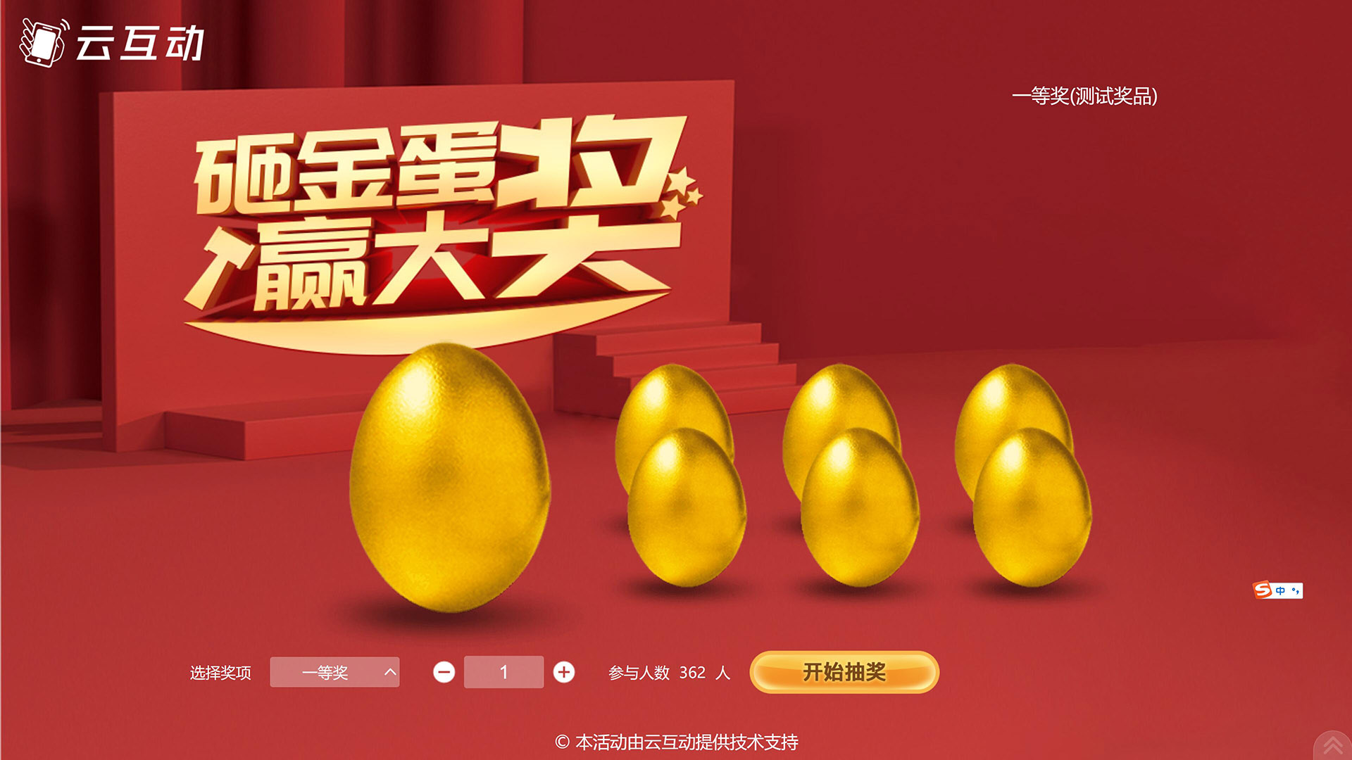 砸金蛋抽奖是滁州云互动系统抽奖功能中可以在现场大屏幕上模拟传统砸金蛋抽奖的应用。可以省去准备金蛋实物等诸多环节。