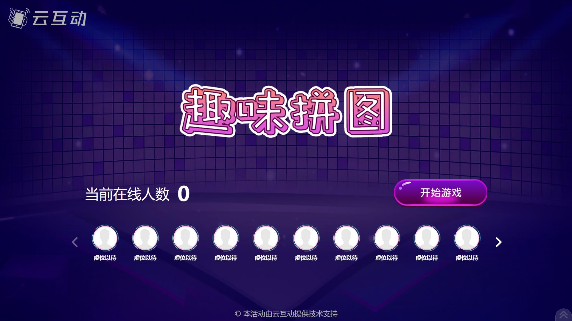 趣味拼图是滁州云互动系统近期推出的现场互动竞技游戏,不同与传统的摇一摇拼手速游戏,趣味拼图是用户在手机端使用手指移动碎片拼成完整的图片参与游戏,大屏幕上实时显示用户得分排行榜,并在倒计时结束后显示排名的互动游戏。玩法新颖,广告植入效果好,因此也很受活动主办方的喜爱。