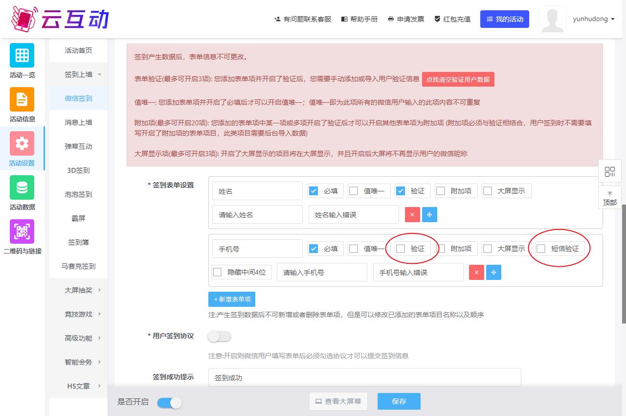 在滁州云互动系统的微信签到表单中添加手机号签到字段后,在字段设置中有两个验证选项,一个“验证”一个“短信验证”,那么这两个验证选项有什么区别呢?分别是有什么作用?